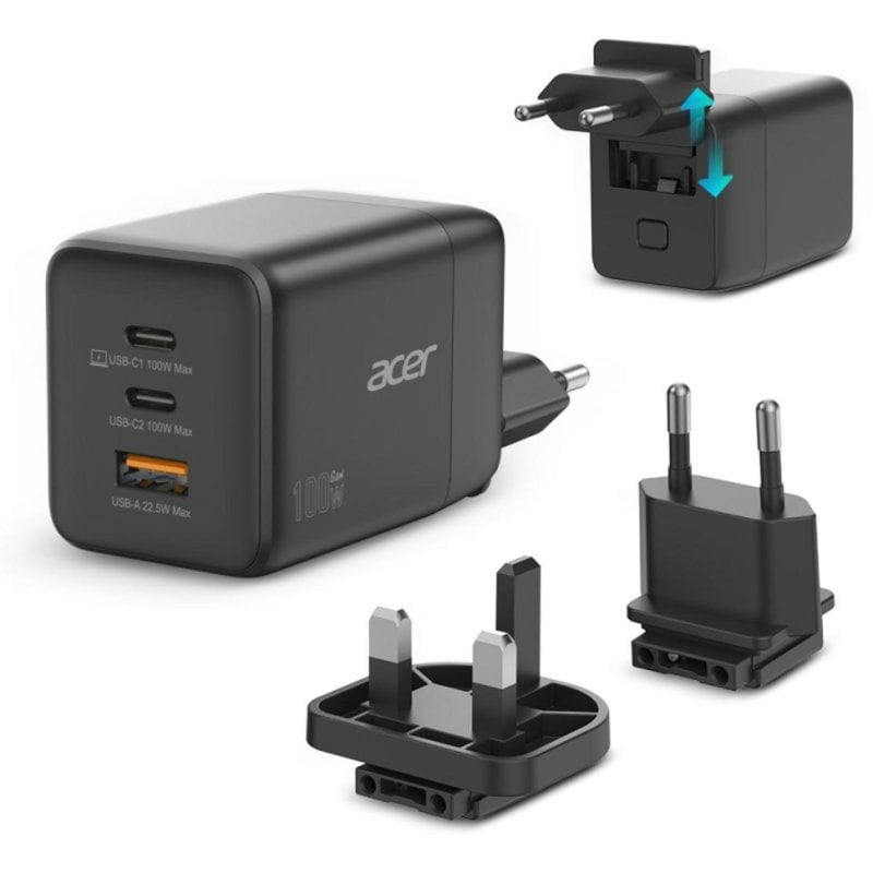 Chargeur GaN Acer 100W 2x USB-C 1x USB-A noir câble 1,5 m charge rapide