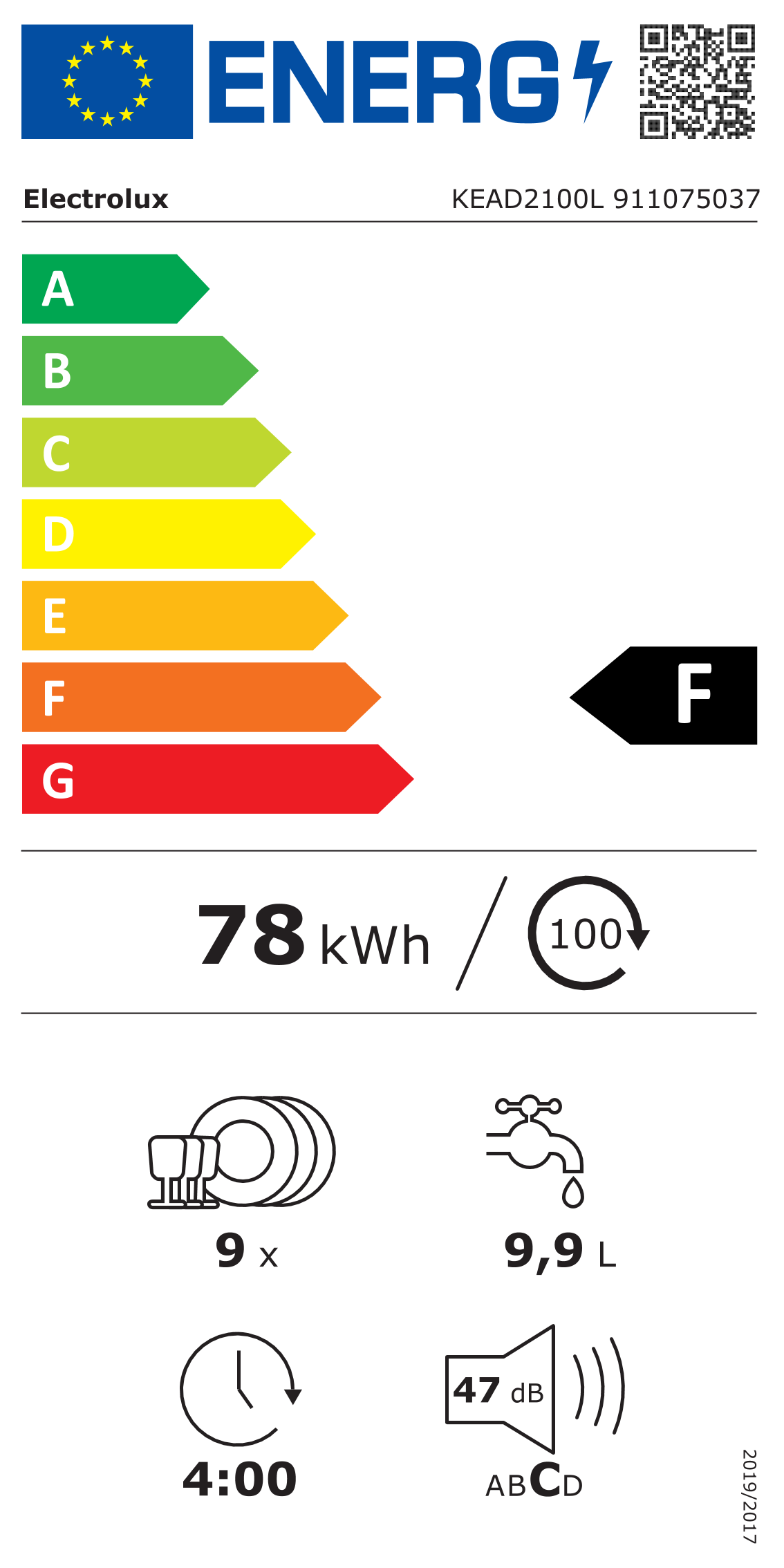 Le KEAD2100L fonctionne à 47 dB (classe C), ce qui le rend discret et adapté aux cuisines ouvertes ou aux appartements.