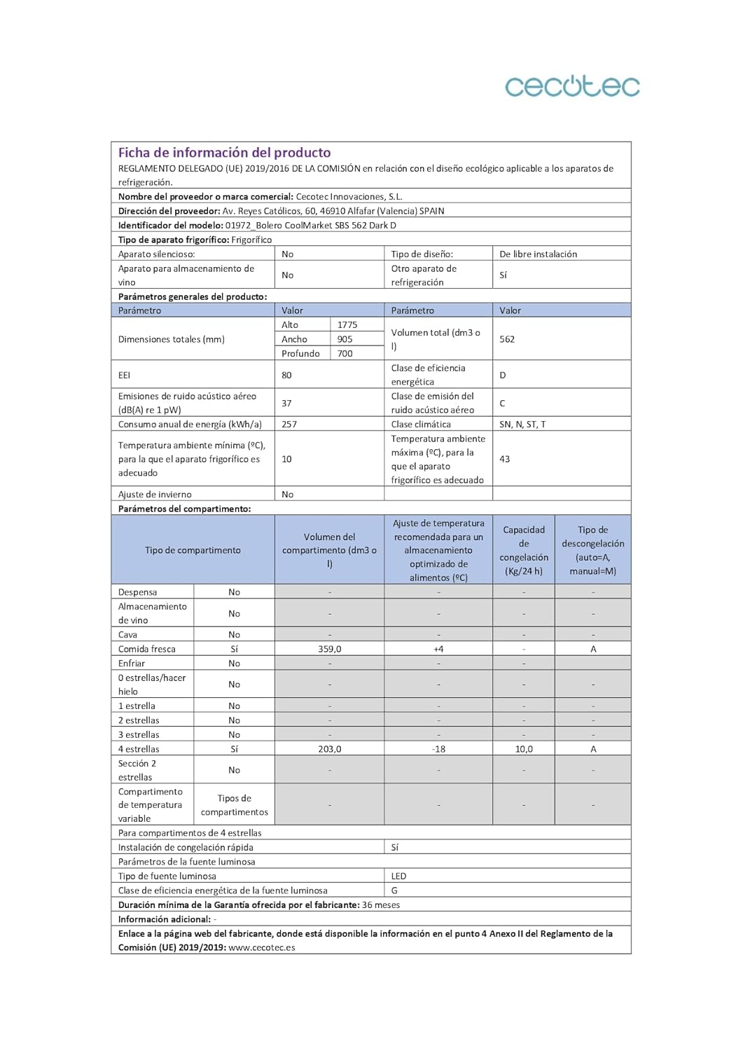 | Volume total net | 562 L |
