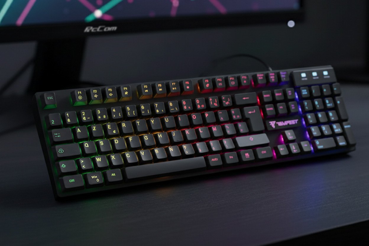 Clavier à membrane avec 104 touches, 19 anti-ghosting et rétroéclairage arc-en-ciel, offrant durabilité, précision et visibilité à tout moment